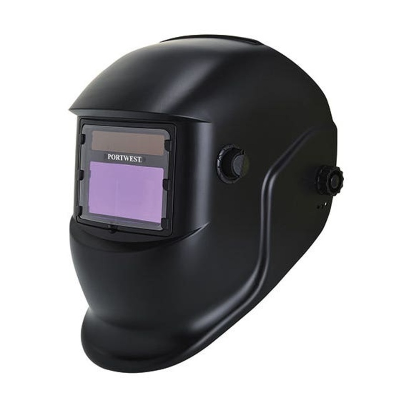 Auto-darkening welding helmet, which switches from a light to dark state when welding activity starts. Light state is DIN 4, Dark state is adjustable from DIN 9 to DIN 13 using the external knob. Response time from light to dark state is 0.04 milliseconds, return from dark to clear state in 0.03-0.04 sec. Power is supplied by solar cells with 2 built-in lithium batteries to offer power back-up for longer service life. No need for replacement batteries.