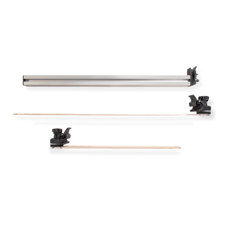 The system includes one extension bar with deadbar clamp, a 28″ long acrylic straight ruler with hub and clamp for attachment to either the extension bar or directly to the deadbar and an 18″ acrylic straight ruler with its own hub and clamp. This system is great for modern straight line quilting, crosshatching and stitching in the ditch.