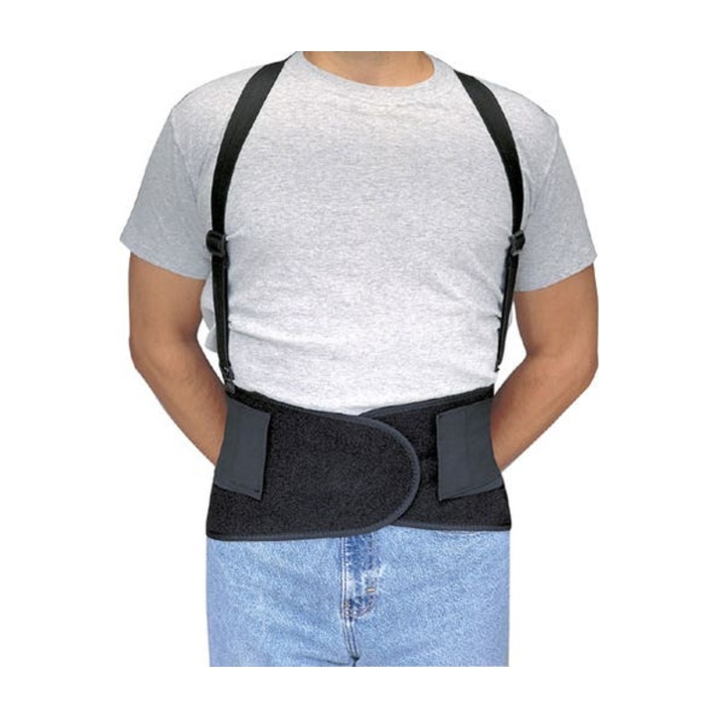 8 in Nylon/Elastic back support. Designed to reduce back stress & strain with positive Velcro material at front and 3 in wide V-shaped elastic side pulls. Includes detachable elastic suspenders for added support. Brand:Pro-Safe
