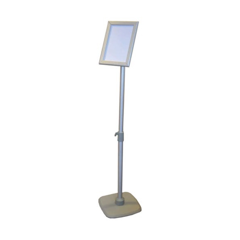Freestanding display stand with telescopic pole. The A3 snap frame is adjustable providing both portrait and landscape options. Colour: Silver Brand:Pro-Source