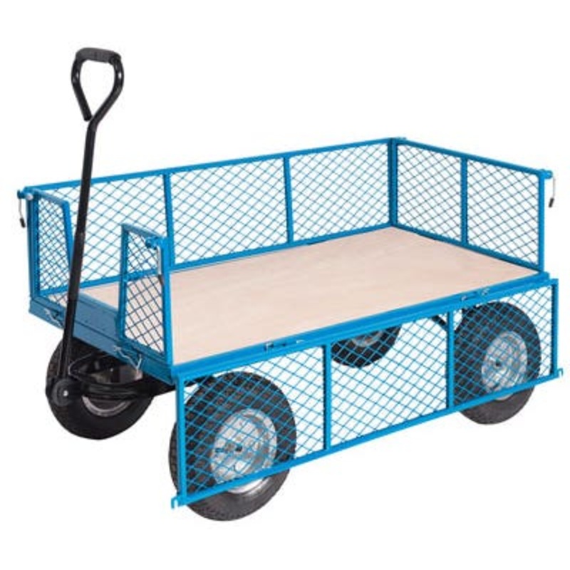 Plywood base, mesh sides & ends Brand:Pro-Source Manufacturer Part Number:TI205R Features & Benefits: Heavy-duty load capacity: 400kg. Available in a variety of options with mesh or plywood base. Mobile on REACH Compliant, 340mm pneumatic steel centred whe