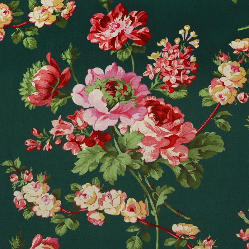 The Rose Garden Peacock fabric brings a rich, romantic flourish to your next project with its lush blooms scattered across a deep emerald background. This timeless floral print showcases dramatic roses, peonies, and lilacs in shades of ruby red, blush pink, and soft yellow, all accented with leafy greens and thorny vines. The high-contrast color palette gives this design a vintage elegance that stands out beautifully in larger cuts. Ideal for backing quilts, making curtains, or creating dramatic statement pieces, this fabric blends classic garden beauty with a bold modern backdrop that adds depth and sophistication to your sewing.