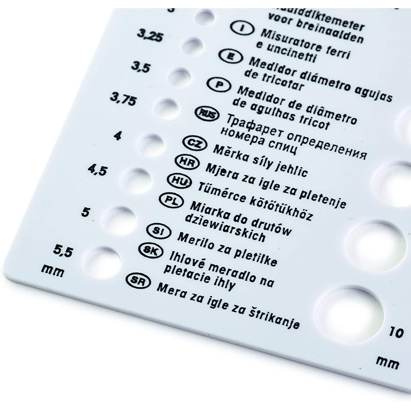 This is where Prym’s knitting pin gauge is a practical aid in determining the knitting pin’s thickness. This useful card made of robust, white plastic has 19 holes with the usual diameters of all common knitting pins ranging from 2mm to 10mm. This allows for every knitting pin gauge to be accurately determined using this practical knitting accessory.