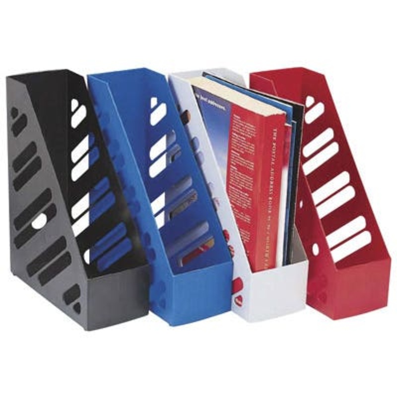 Black magazine rack accepts A4 and foolscap documents. Ideal for neatly storing magazines, catalogues, price lists etc. Unique capacity for two standard ring binders.