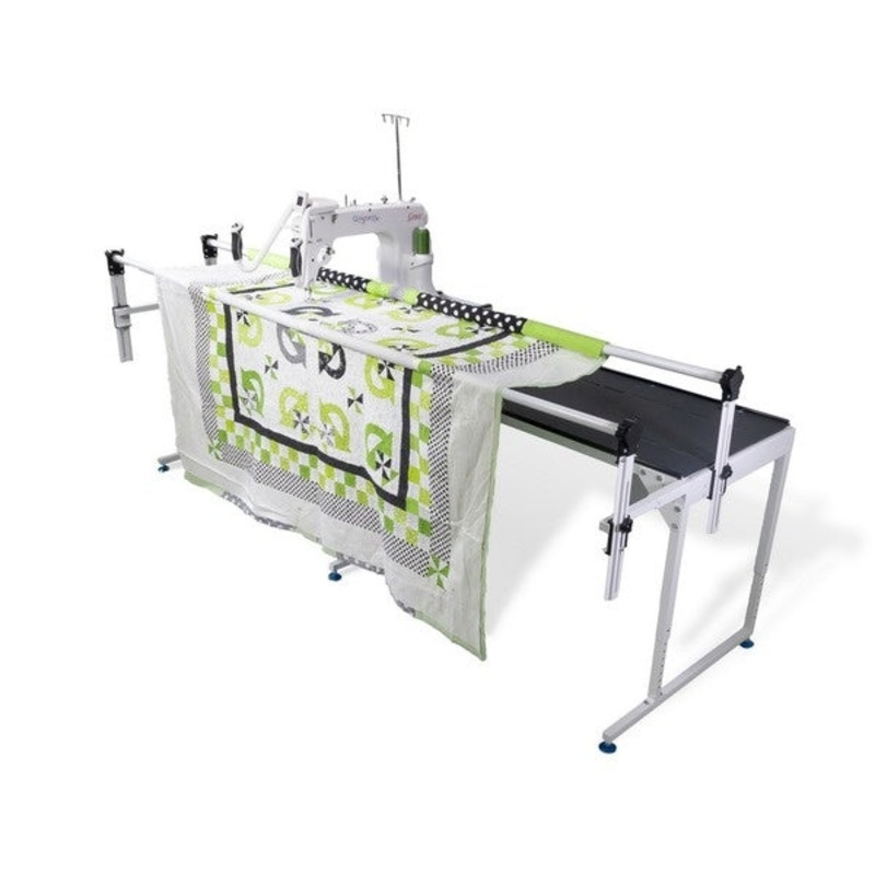 Q-Zone Hoop Frame has steel square poles and, combined with the white quilt clips, gives the customer precise ratcheting. As a quilter they can grow with the frame because the arms can extend out in front to accommodate up to a 19 throat machine. The ability to have the customer start with their home/domestic machine and finish with a long arm on the same frame is not common. Customers who are looking to save money by using their own machine, and dont have space for a standard frame, will love the Q-Zone Hoop Frame.