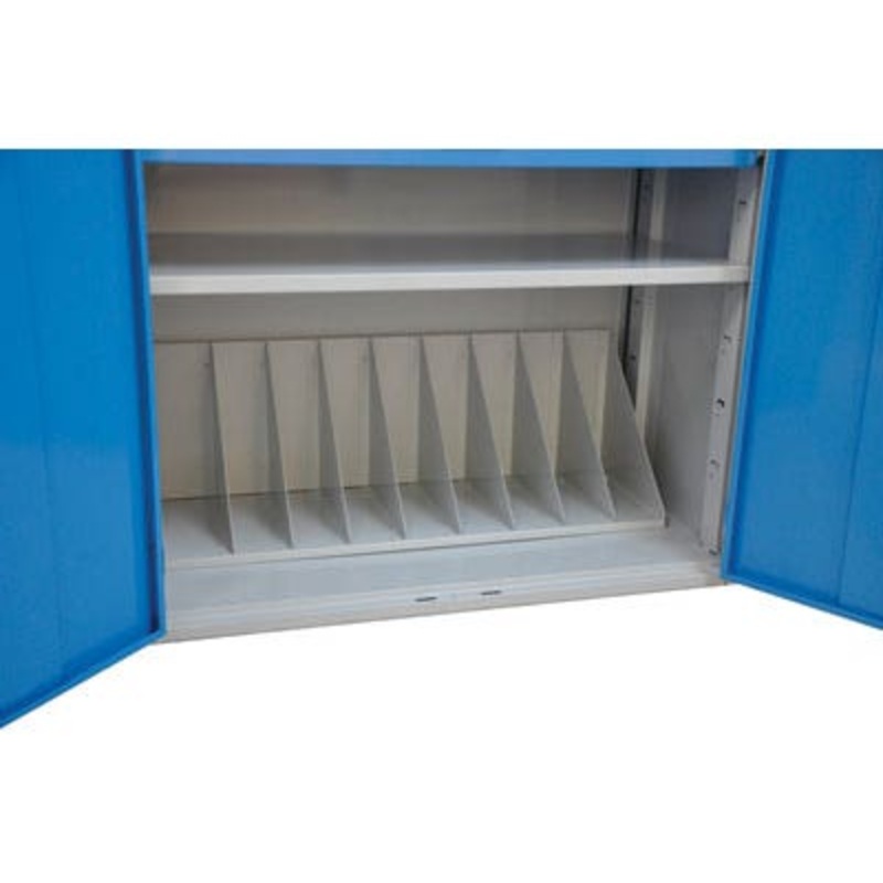 Fitted with lockable storage drawer and powder coated adjustable shelves