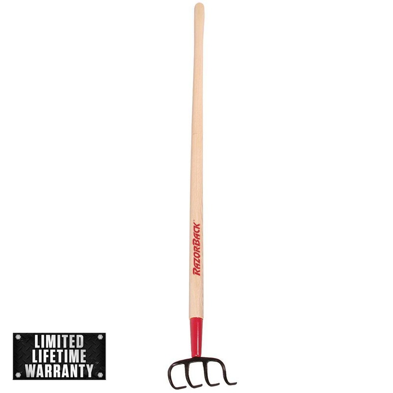 Razor-Back 68115 4-Tine Soil CultivatorThe Razor-Back cultivator is perfect for cultivating, weeding and aerating soil. The steel head and wooden handle are strong and durable. Great tool for professional or personal use.Forged steel headSteel ferrulePremium 54 in. North American hardwood handle4 sharp, curved tinesDimensionsHandle Length (in.)54 inHead Width (in.)5Product Depth (in.)4.3 inProduct Height (in.)57 inProduct Width (in.)5 inTine length (in.)4DetailsFeaturesCoated tinesGarden Tool Handle StyleLong HandleHandle MaterialWoodHead MaterialSteelNumber of tines4Product Weight (lb.)2.4 lbShort or Long HandleLongTine MaterialSteel