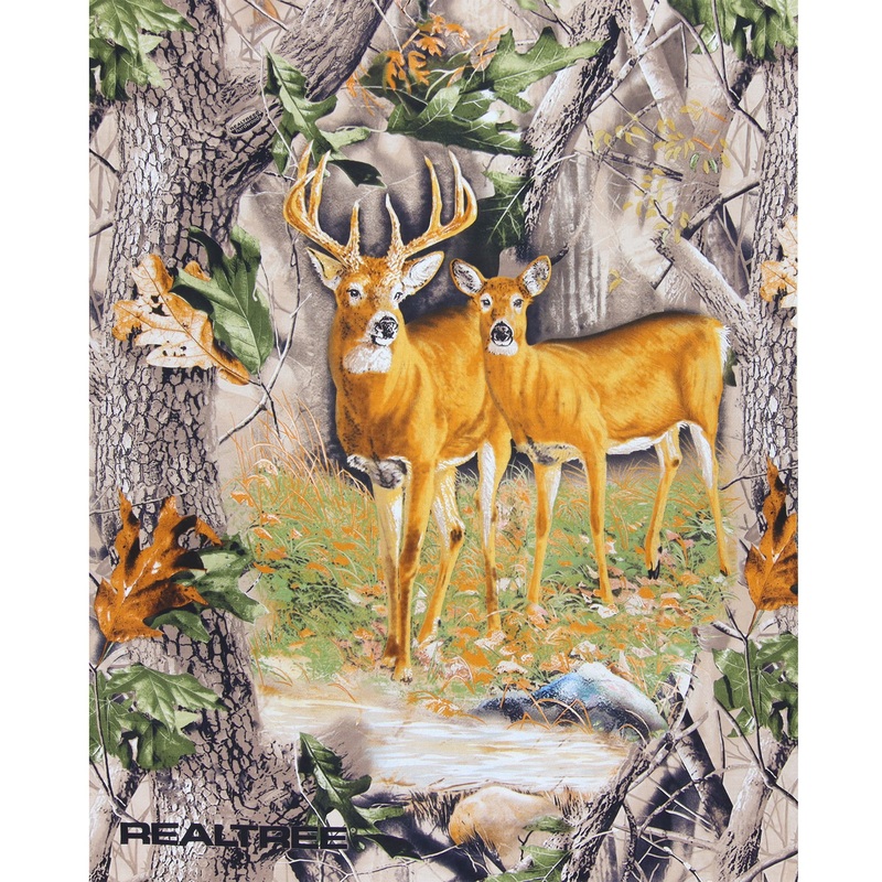Capture the beauty of the wild with the Realtree Buck & Doe Fabric Panel. Measuring 36″ x 44″, this striking panel showcases a lifelike buck and doe standing alert in a forest clearing, surrounded by tree bark, autumn leaves, and a soft stream bed. The detailed woodland backdrop and realistic wildlife imagery make it a standout piece for rustic quilts, wall hangings, or lodge-style dcor. Printed on 100% cotton, this panel is easy to care formachine wash cold, tumble dry low, use non-chlorine bleach as needed, and do not iron to maintain its vivid detail.