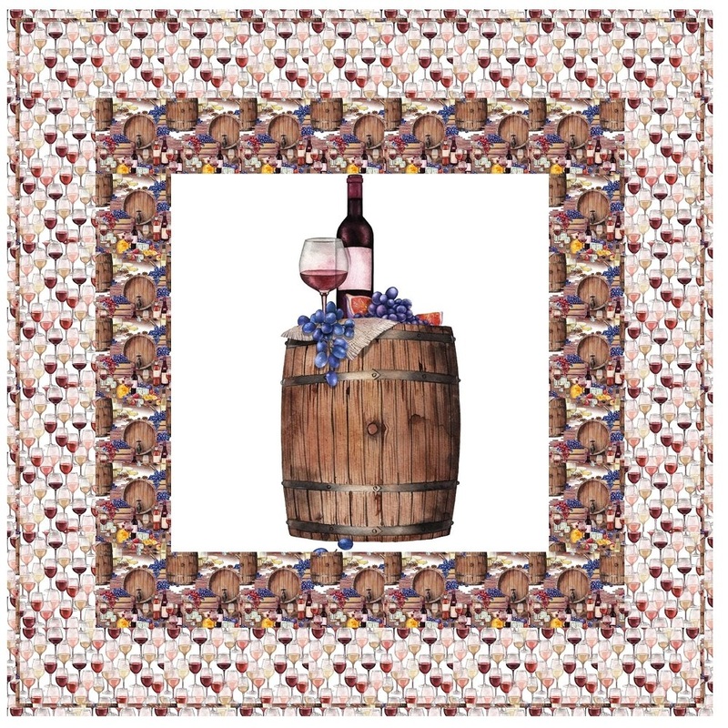 The Red Wine Dining Wall Hanging includes everything that you need to make the quilt – the instructions and a total of 3 1/2 yards of fabric and a 23″ panel. It has two borders and is finished with a flange binding. Batting is sold separately. The finished size of this quilt is 42″ x 42″.
