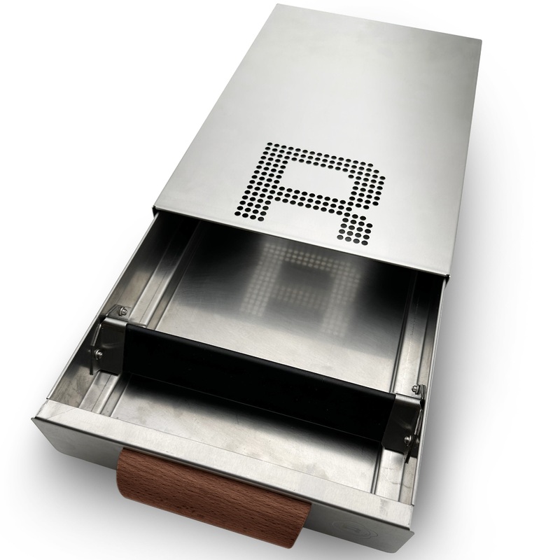 Just like their espresso machines, Rocket Espresso’s Knock Box Drawer is functional and stylish. The drawer’s large surface can accommodate the full range of Rocket’s grinders while the stylized Rocket “R” ventilation permits steam and moisture from knocked out pucks to escape through the top. Inside a rubber knock bar protects portafilters when knocking out pucks while an elegant wood handle allows for easy opening and closing.