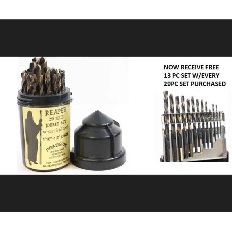 Reaper High Speed Steel Drill Bits are made of patented high-molybdenum alloy that stands the test of time. Reapers 135 degree split point eliminates the need for predrilling or punching. The precision ground flutes, nitro-carburized finish, and extra wide web design facilitates fast chip removal thus preventing bits from over heating and becoming brittle. Reaper High Speed Steel Drill Bits cut stainless steel, spring steel, even grade 8 bolts. Sizes 3/16 on up have shanks with three ground flats which prevent slippage in drill chucks. We offer a wide assortment of Reaper High Speed Steel Drill Bits jobber & stubby sets including fractional sizes from 1/16 up to 1/2 by 64ths, number sizes from #1-80, letter sizes A-Z, and metric sizes from .5 mm up to 13 mm by .5 mm, as well as Silver & Demming sizes from 9/16 up to 1-1/2 & 24 mm.