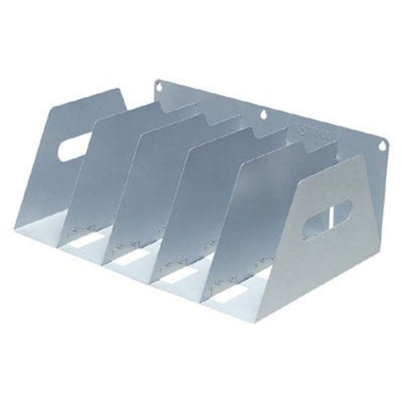 Grey, rigid and durable rack for housing lever arch files, directories etc. Manufactured from powder coated steel. Fixed dividing plates have rounded corners. Available in 5 lever arch capacities. Can be wall mounted.