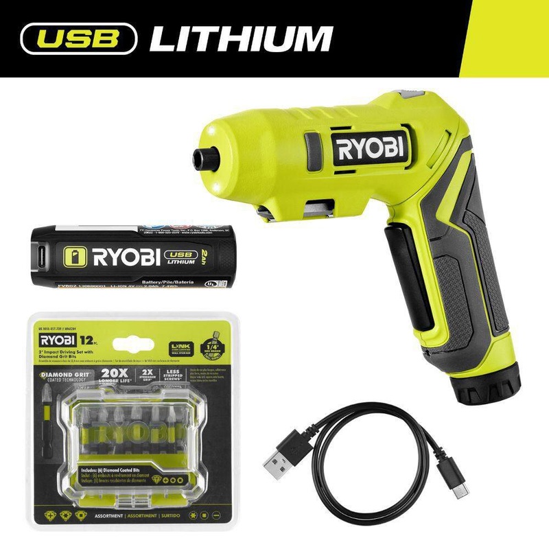 RYOBI FVD50K-A961204 USB Lithium Screwdriver Kit with 2.0 Ah USB Lithium Battery, Charging Cable, & 2 in. Diamond Grit Driving Set (12-Piece)RYOBI introduces the USB Lithium Screwdriver Kit with 2.0 Ah USB Lithium Battery, Charging Cable, & 2 in. Diamond Grit Driving Set (12-Piece). The RYOBI USB Lithium Screwdriver features a pivoting head for increased accessibility during every application. The on-board bit storage prevents losing bits and ensures convenience. The dual LED worklight creates extra visibility for all your projects needs. The included USB Lithium 2Ah battery features a USB-C port that also charges mobile devices, and a LED fuel gauge that clearly indicates the battery level status with the press of a button, eliminating guess work. The product also features an LED indicator to signal when the battery is charged (green) or has low battery (red) while in-use. Best of all, it is part of the RYOBI USB Lithium System of tools that provides compact, rechargeable, everyday solutions for cordless power and productivity. This USB Lithium Screwdriver is backed by the RYOBI 2-Year Manufacturers Warranty and includes (1) USB Lithium Screwdriver, (1) USB Lithium 2Ah Battery, (2) Bits, (1) USB Cable, 2 in. Diamond Grit Driving Set (12-Piece), and Operators Manual.Pivot to in-line position for various applicationsDual LEDs for improved visibilityOn-board bit storage holds (2) 1 bitsLED light on the tool turns green or red to indicate the life of your battery chargeThe included USB Lithium 2Ah battery features a USB-C port that also charges mobile devicesLED fuel gauge on the battery indicates battery level status with the press of a buttonThe RYOBI USB Lithium Battery System: Everyday Solutions. Rechargeable Power.2-year manufacturers warrantyIncludes: FVD50 USB Lithium Screwdriver, FVB02 2.0 Ah USB Lithium Battery, (2) Bits, USB Cable and Operators ManualIncludes: A961204 (1) diamond PH1, (2) diamond PH2, (1) diamond PH3, (1) diamond T25, (1) diamond SQ2, (1) T20, (2) T25, (1) SL8, (1) SL10, and (1) SQ2DimensionsProduct Depth (in.)9.4 inProduct Height (in.)1.9 inProduct Width (in.)1.6 inDetailsBattery Amp Hours2 AhBattery Power TypeLithium IonBattery Voltage (V)4VCharger IncludedCharger IncludedChuck Size (In.)1/4 In.Chuck TypeKeylessColor FamilyGreenConditionNewCordless Tool TypeScrew GunCordless/CordedCordlessDrill/ Driver TypeElectric ScrewdriverIncludedBattery Included, Bits, ChargerMaximum Speed (RPM)200 RPMMotor TypeBrushedNumber of Total Batteries Included1Power Tool FeaturesBuilt-In Light, Compact, Cushioned Grip, Keyless Chuck, Pivot Head, Spindle LockProduct Weight (lb.)0.9 lbTools Product TypePower ToolTorque (lb-in)55 In lbsAdditional ResourcesFrom the ManufacturerSDSProduct BrochureWarrantyUse and Care Manual
