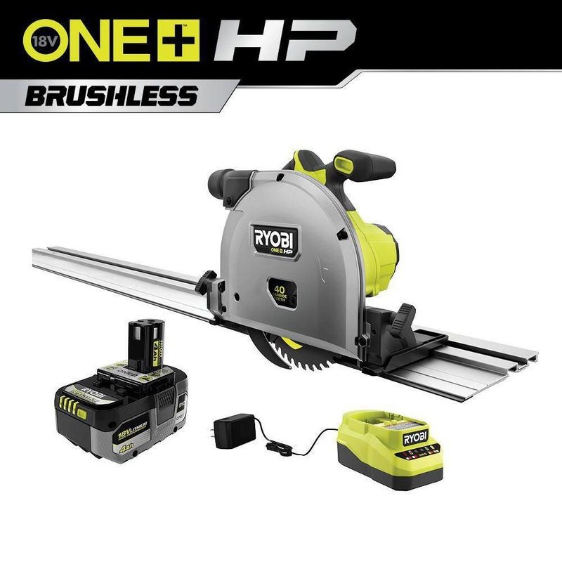 RYOBI PTS01K ONE+ HP 18V Brushless Cordless 6-1/2 in. Track Saw Kit with 4.0 Ah HIGH PERFORMANCE Battery and ChargerEnhance your RYOBI 18V ONE+ System with the RYOBI 18V ONE+ HP Brushless 6-1/2 in. Track Saw. ONE+ HP Technology combines a powerful brushless motor, advanced electronics, and HIGH PERFORMANCE lithium-ion batteries to deliver up to 260 linear feet of cutting per charge, when paired with the included 4.0 Ah HIGH PERFORMANCE battery. Combine (2) 27.5 in. included tracks for up to 55 in. of controlled, accurate cuts, and add additional tracks for extended continuous cutting. This saw can make -1 to 48 bevel cuts and has a 1-15/16 in. depth of cut capacity at 90 (with track). Make controlled and accurate cuts quickly, with up to 4,300 RPM. Cut with confidence, as this saw comes equipped with an adjustable depth control switch and depth scale for precise score and plunge cuts, as well as a track adjust and anti-tip adjustments to ensure smooth and accurate cuts. An additional 55 in. Track For Track Saw with (2) 27.5 in. Tracks, and (4) Connector Bars are sold separately as an accessory, Model A73TS01N. Best of all, it is part of the RYOBI 18V ONE+ System of over 300 Cordless Products that all work on the same battery platform.This brushless track saw is backed by the RYOBI 3-Year Manufacturers Warranty and includes the 18V ONE+ HP brushless 6-1/2 in. track saw, 40T carbide-tipped blade, (2) 27.5 in. tracks, riving knife, track clamp, blade wrench, track wrench, 18V 4.0 Ah HIGH PERFORMANCE battery, charger, and operators manuals.