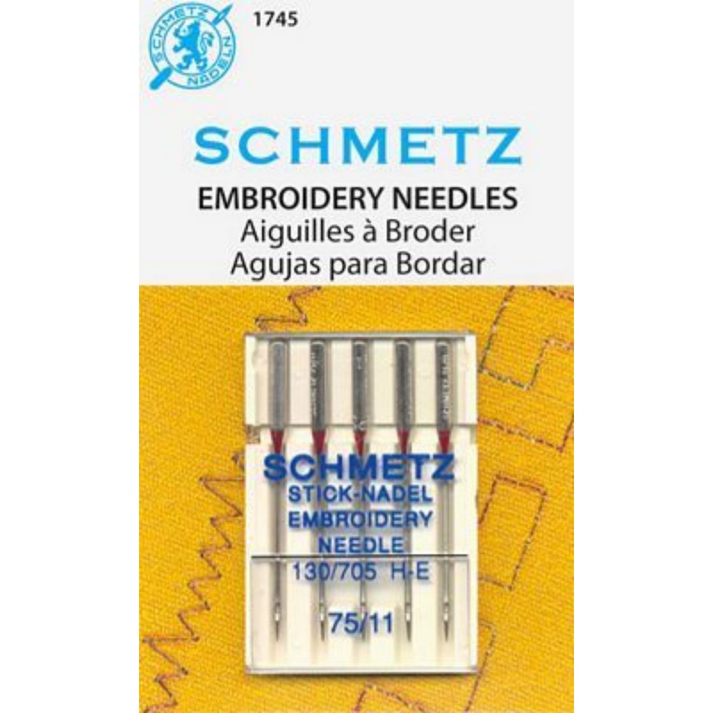 Light ball point with especially wide eye and enlarged groove in scarf allow for smooth machine embroidery with all types of threads from voluminous woolens to metallics & other more fragile threads. System: 130/705 H-E. Size 11/75. 5 needles per pack.