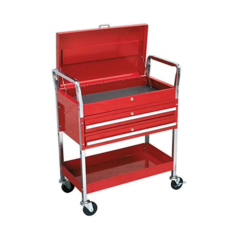 Two-level trolley with two lockable drawers and all bearing slides and liners, give additional tool security. Garage or workshop trolley with an 80kg capacity per shelf. Four large castors, two locking.