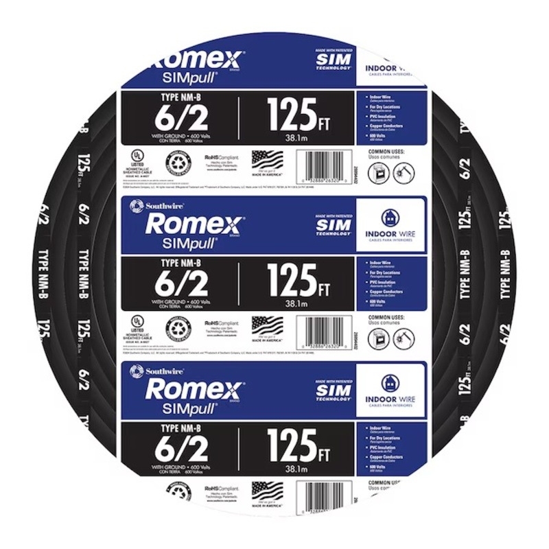 Southwire 28894402 125-Feet 6 / 2 / Romex SIMpull Stranded Indoor CU NM-B W/G Individual pack ( By-the-roll )Southwires SIMpull designed for easier pulling, resulting in easier installation.Coated in patented SIMpull Cable Jacket for easier pulling, stripping, and installation.Romex Type NM-B Copper Building Wire is commonly applied in residential building wiring as a branch circuit for switches and outlets.Installation above ground and in dry locations only.The voltage rating of the cable is 600 volts.NM-B cable may be run in air voids of masonry block or tile walls where such walls are not wet or damp locations.Made in AmericaGeneralJacket ColorBlackSub-BrandN/ASeries NameRomex SIMpullDimensionsCable Length (Feet)125FeaturesCommercial/ResidentialCommercial/ResidentialPackage Quantity1Direct BurialNoPackage TypeIndividual packFire ResistantNoRoHs CompliantYesGround WireYesShieldedNoJacket MaterialPolyvinyl chlorideStranded or SolidStrandedUse LocationIndoorMaximum Amperage55UV ResistantNoMoisture ResistantYesVoltage Rating600Number of Conductors2Wire Cut TypeBy-the-rollNumber of Conductors (Wire 2)0Wire Gauge6Number of Pairs0