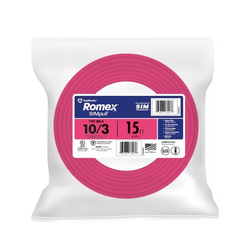 Southwire 63948527 15-Feet 10 / 3 / Romex SIMpull Solid Indoor CU NM-B W/G Individual pack ( By-the-roll )Southwires Romex SIMpull type NM-B may be used for both exposed and concealed work in normally dry locations at temperatures not to exceed 90C.Southwires Romex SIMpull type NM-B may be used for both exposed and concealed work in normally dry locations at temperatures not to exceed 90CNM-B cable is primarily used in residential wiring as branch circuits for outlets, switches, and other loadsNM-B cable may be run in air voids of masonry block or tile walls where such walls are not wet or damp locationsVoltage rating for NM-B cable is 600 voltsCopper conductors are annealed (soft) copperSouthwires SIMpull designed for easier pulling, resulting in easier installationUL listedGeneralSeries NameRomex SIMpullDimensionsCable Length (Feet)15FeaturesCommercial/ResidentialCommercial/ResidentialPackage Quantity1Direct BurialNoPackage TypeIndividual packFire ResistantNoRoHs CompliantYesGround WireYesShieldedNoJacket MaterialPolyvinyl chlorideStranded or SolidSolidUse LocationIndoorMaximum Amperage30UV ResistantNoMoisture ResistantYesVoltage Rating600Number of Conductors3Wire Cut TypeBy-the-rollNumber of Pairs0Wire Gauge10