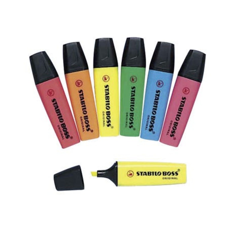 Stabilo Assorted Stabilo Boss Pen - Pack of 8 Brand:Stabilo Colour:Assorted Manufacturer Part Number:SS70101 Pack Quantity:10 Features & Benefits:Brighter colours, longer lasting and good value Wedge tip draws broad lines and underlines creating a line wid