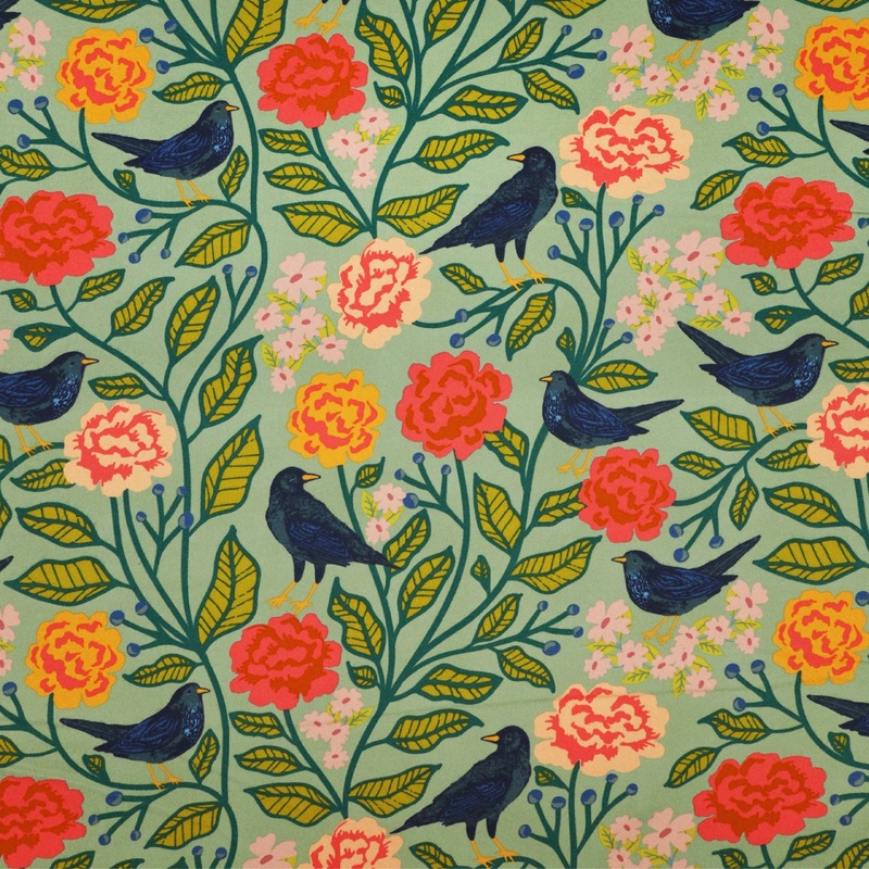 Rich in color and touch, the Blackbird Aviary in Flannel print brings together deep navy birds perched among flourishing blossoms in warm tones of coral, yellow, and blush, all set against a soft sage green backdrop. This fabric is 100% cotton and measures
