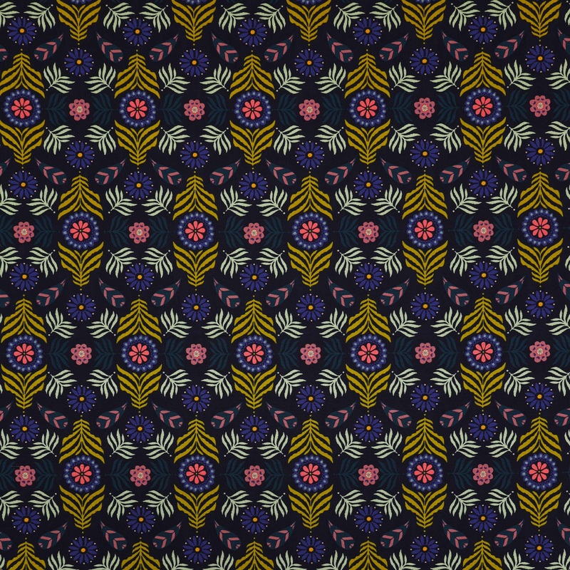 Bold and enchanting, the Bloom Plume print bursts with intricate floral arrangements in shades of deep violet, blush pink, and coral, framed by golden ochre leaves and accented with delicate ivory fronds against a dark, inky backdrop. The symmetrical layout and rich contrasts give the design a striking, almost regal quality, while the layered details invite a closer look, making it ideal for statement projects. Its sophisticated color palette makes it versatile for both modern and traditional creations, from quilts to apparel to eye-catching home dcor. Printed on 100% cotton and measuring approximately 44″ wide, this fabric combines beauty with durability, offering endless inspiration for sewists who want to bring a touch of artistry into their work.