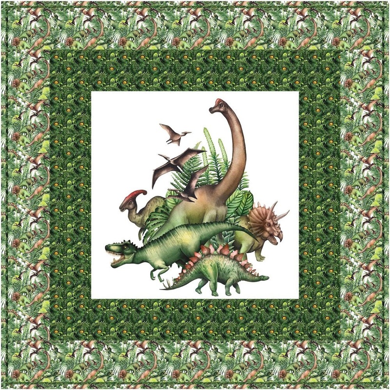 The World of Dinosaurs Wall Hanging / Lap Quilt Kit includes everything you need to make the wall hanging – the instructions, the panel, and a total of 3 1/2 yards of fabric for sashing, flange binding, and backing. Batting is sold separately. The finished size of this quilt is 42″ x 42″.