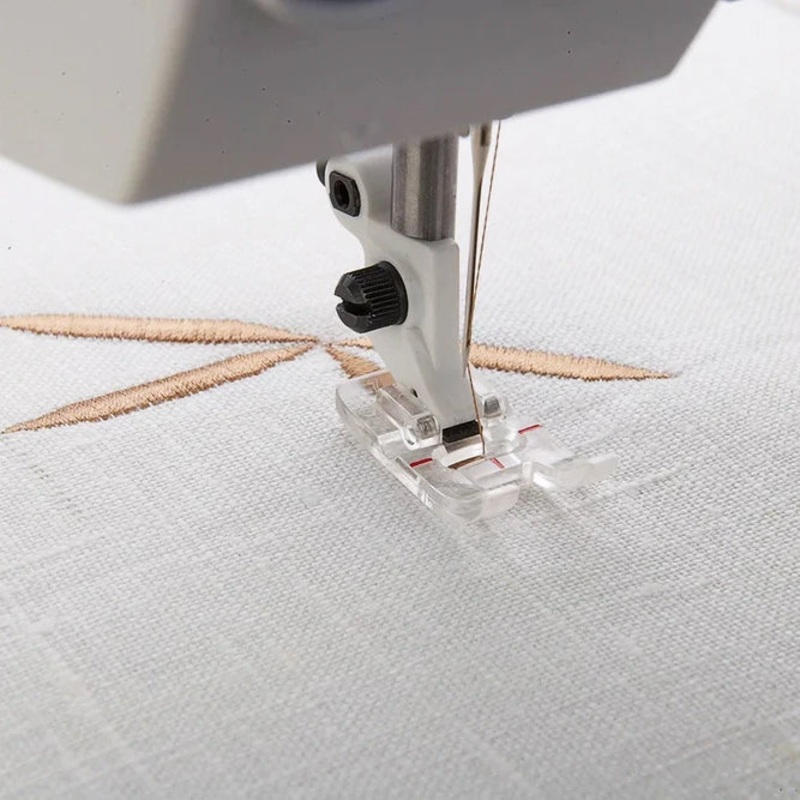 Perfect for satin stitch appliqu, taper stitches, and decorative stitching, the Transparent B Foot provides smooth feeding over stitches with its tunnel-shaped underside. The clear design with red guidelines enhances visibility and accuracy, making precise