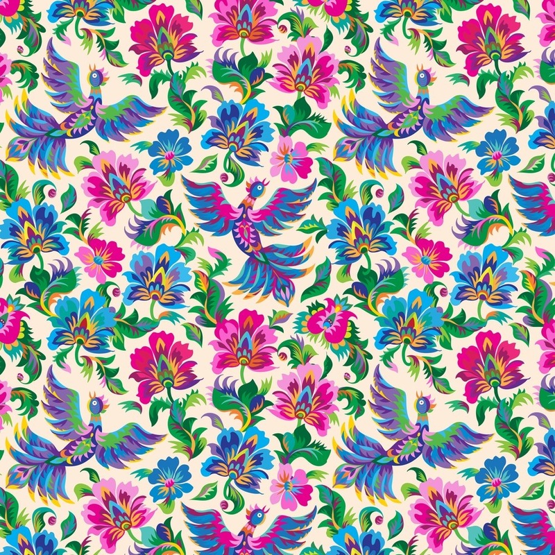 The Multi-Colored Ukrainian Fantasy Birds With Floral Design Fabric is part of the Ukrainian Folk Painting Fabric Collection printed by Sew Creative Fabrics. Digitally Printed on 100% cotton. Sew Creative Fabrics prints are only available through Sewing Pa