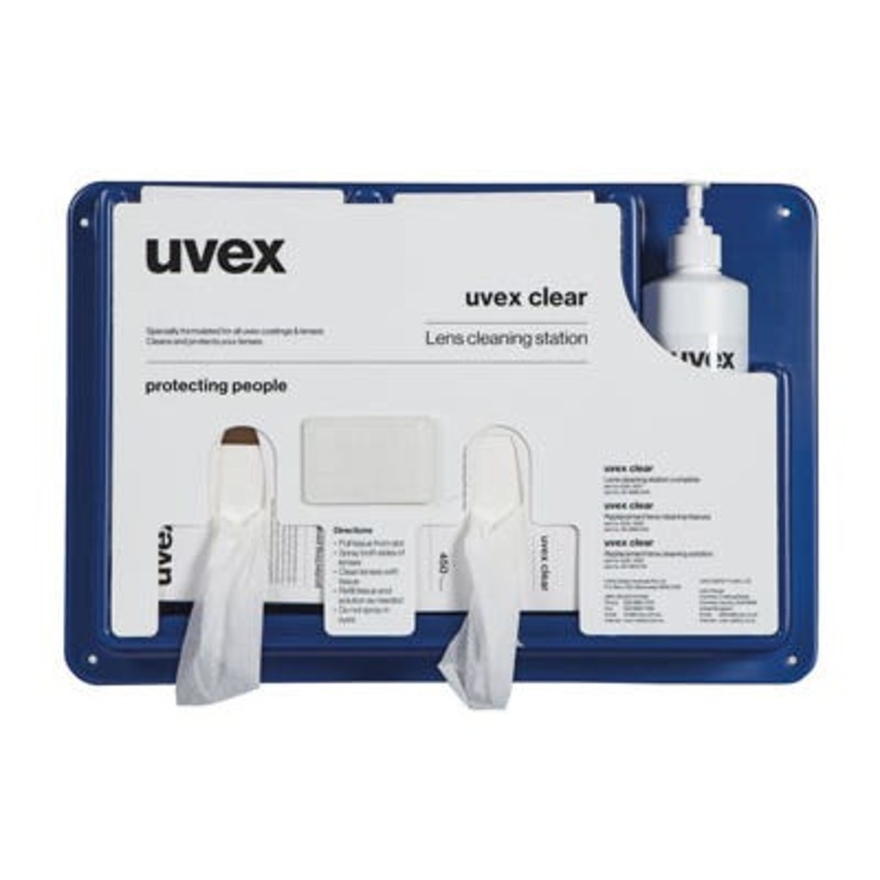 Lens cleaning station helps prolong product life and increase wearer safety. It measures (W) 340 x (L) 480 x (H) 165mm. Replacement tissues and cleaning fluid are available. Brand:UVEX Manufacturer Part Number:9970007 Number of Tissues:4 x 450 Additional I