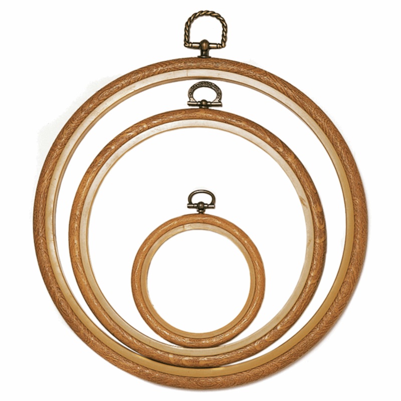 Circular, plastic imitation wood frame to display needlecraft, art and craft pieces.