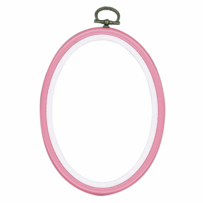 Pink oval, plastic frame to display needlecraft, art and craft pieces.