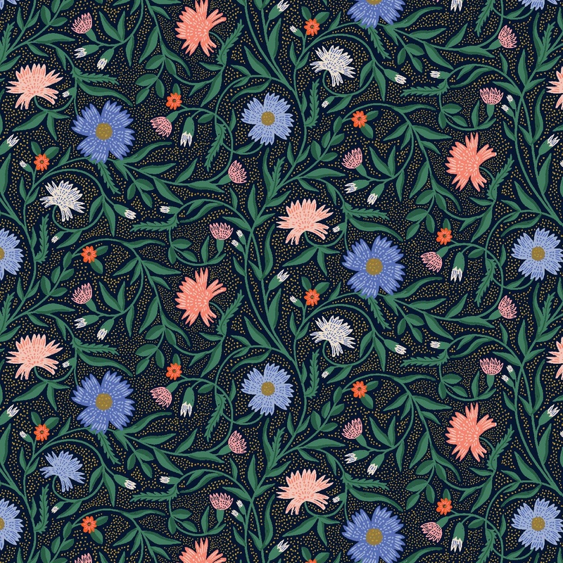 Vintage Gardenby Rifle Paper Co.for Cotton + Steel fabrics.Color: Aster Navy Metallic | RP1002-NA2M100% cotton44" - 45" wideCoordinating fabrics available!All Sales Final.All Fabric is sold in 1/4 yard increments.