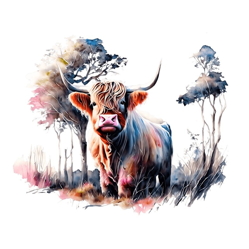 The Watercolor Highland Cow Portrait Fabric Panel is a part of the Farm Animals Fabric Collection printed by Sewing Parts Online. Digitally Printed on 100% cotton.