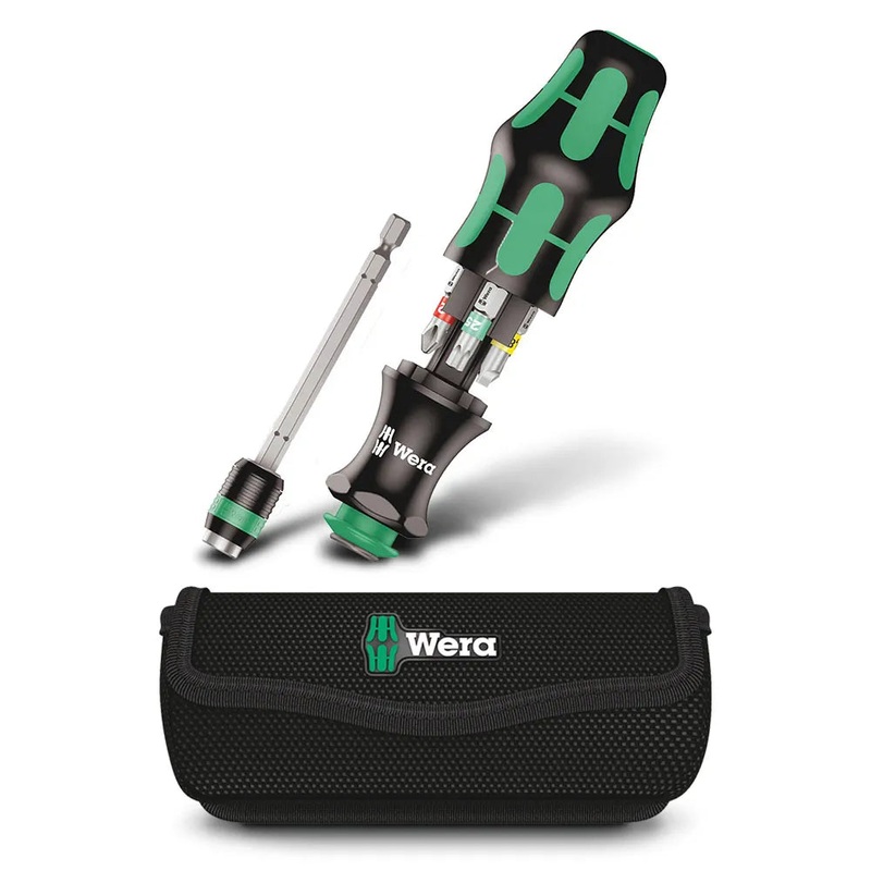 The Wera compact tool with multi-component Kraftform handle for high working speeds and particularly ergonomic screwdriving. Integrated bit magazine in the handle.